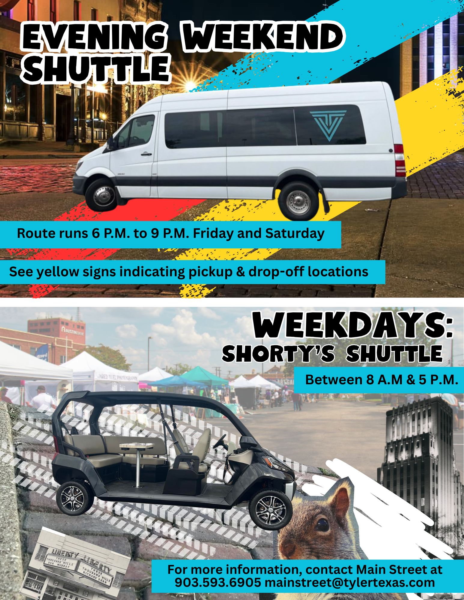 To alleviate the inconvenience caused by reduced parking, the City of Tyler now offers two free shuttles to the public, which pick up and drop off patrons at both public parking garages. See the graphic below for more information.